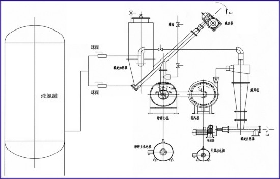 1、工藝流程:本產(chǎn)品整套超低溫機(jī)械粉碎機(jī)由料倉、機(jī)械粉碎機(jī)、引風(fēng)機(jī)、旋風(fēng)器、出料器、液氮罐(用戶自配)等組成;